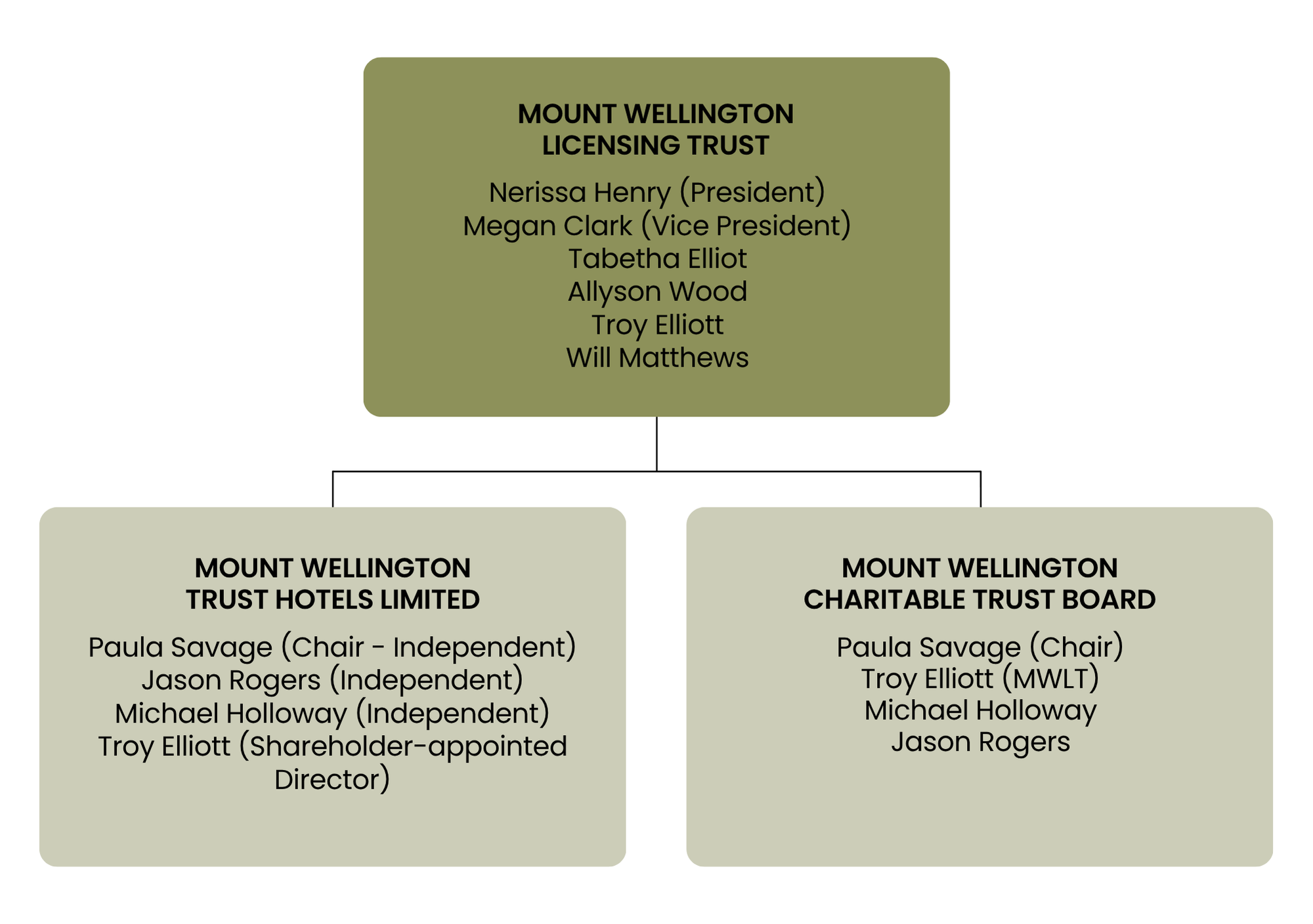 Mount Wellington Licensing Trust – the holding company. Owns the shares in Mount Wellington Trust Hotels, and controls Mount Wellington Charitable Trust. Trustees are elected at local body elections every three years.